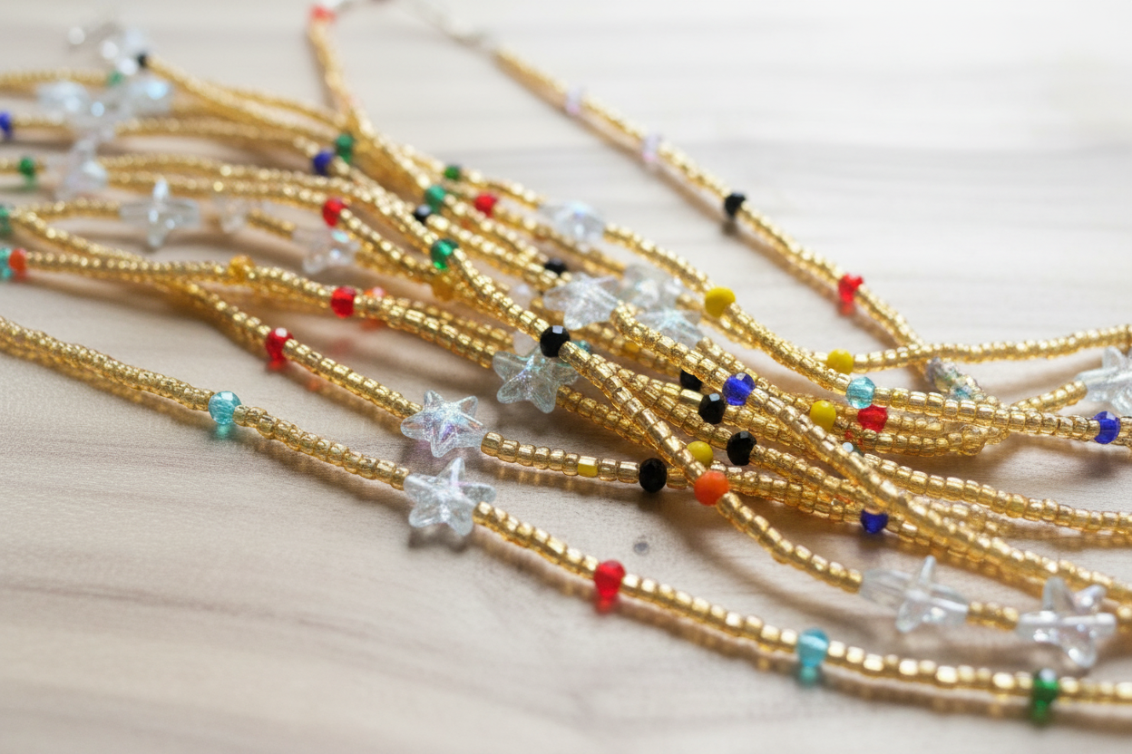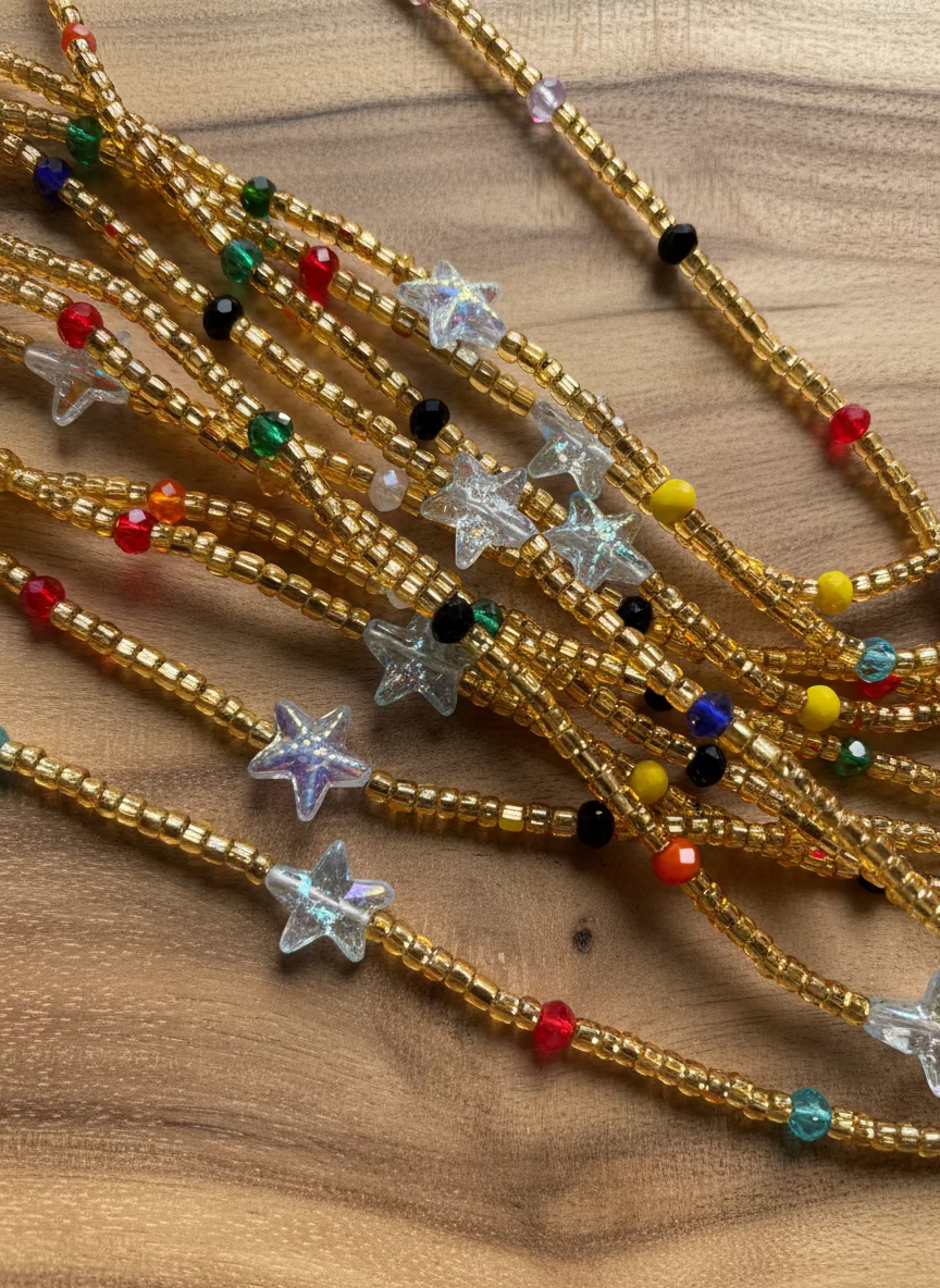 • Price is per strand• Approximately 65-70 inches in length• Made on non-elastic thread (no clasp)• Handcrafted in Ghana